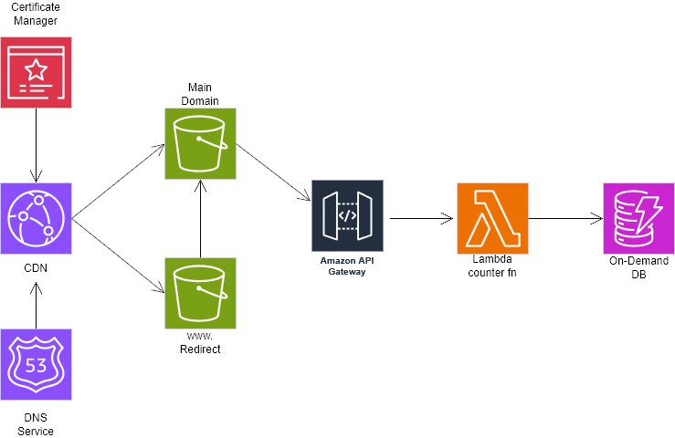 The résumé site itself is static, but I added a dynamic touch, namely a live visitor counter powered by API Gateway, Lambda, and DynamoDB.